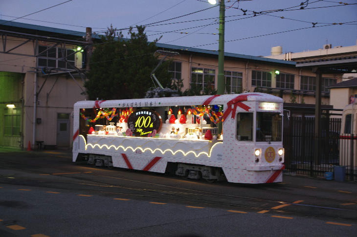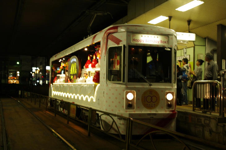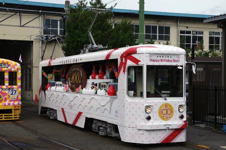 | 花電車のデザインは、100周年を祝うバースデーケーキをイメージしたそうです |