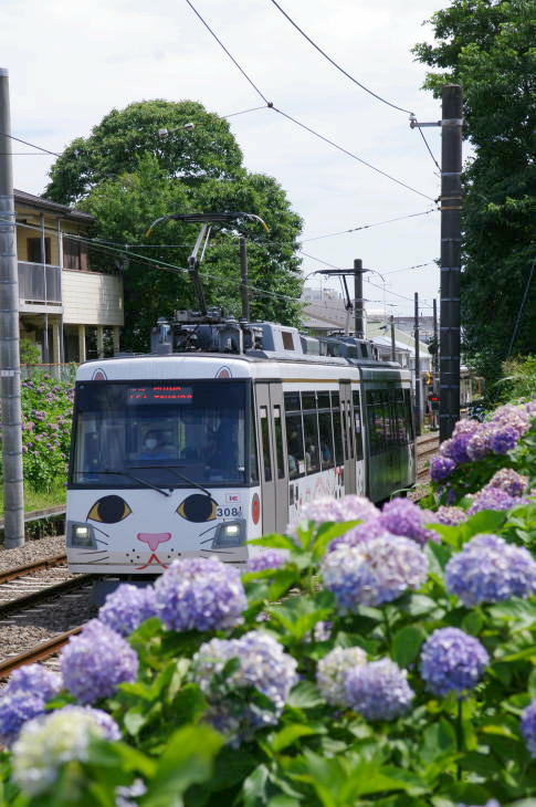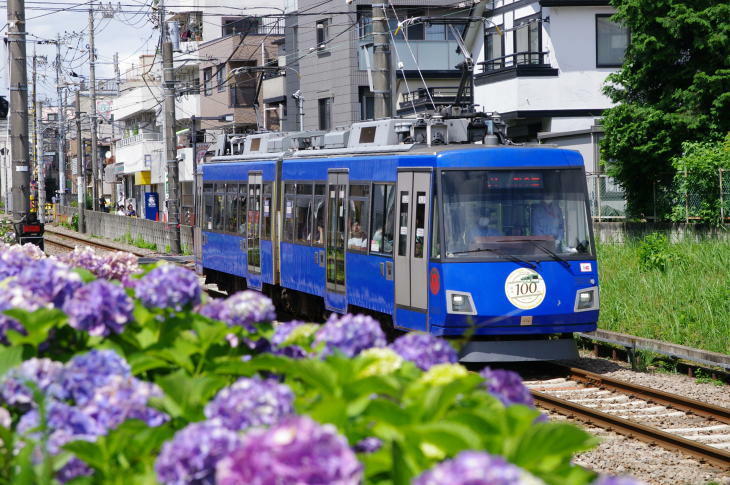 令和7年の梅雨は、7月18日に開けたとみられると発表されました。 梅雨の期間中も晴れの夏日が続き、陽性型の梅雨と言われました。 その影響で、日照りが続き、紫陽花は色付いても枯れてしまう、植物には厳しいつゆとなりました。 見頃の紫陽花と、枯れた紫陽花、これから見頃となる紫陽花が入り乱れた6月26日に、東急世田谷線を訪問しました。 車両は、平成11年7月から導入された300系が活躍していました。